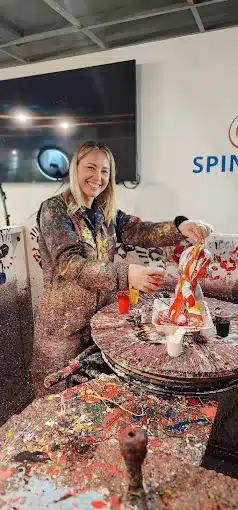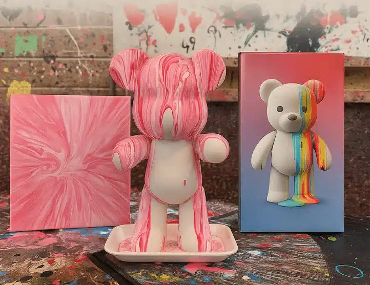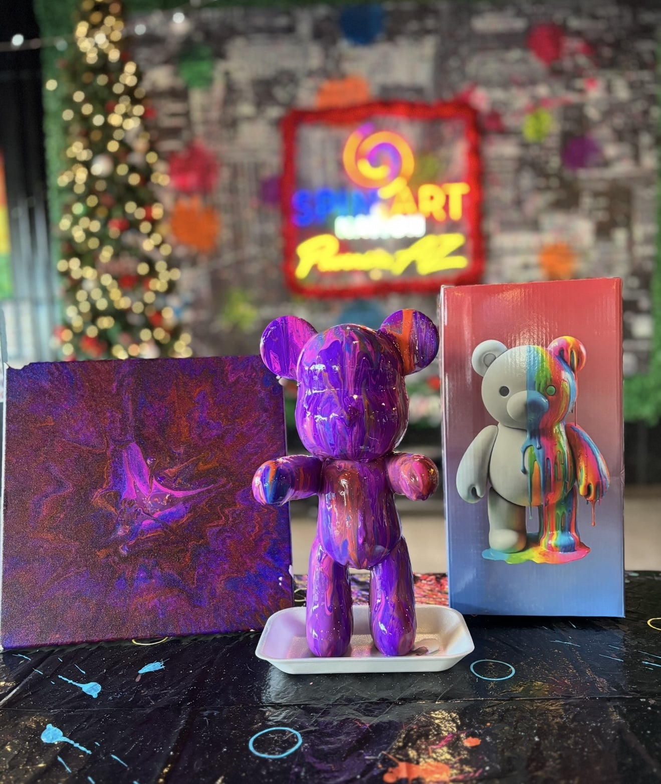 Guests design their own bear sculpture by pouring layered paint to create a unique marbled finish.